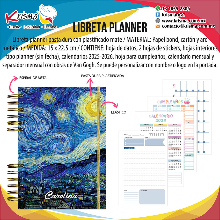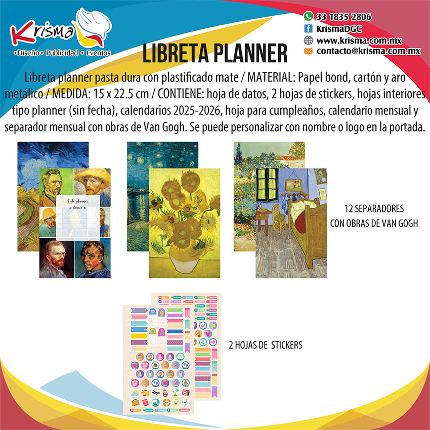 CONTIENE: 363 páginas (182 hojas), hoja por día, sábado y domingo una hoja, calendarios anuales 2025-2026, hoja de datos personales, hoja para cumpleaños, calendarios mensuales, 12 separadores con varias de las obras de Van Gogh, 2 planillas de stickers y elástico.