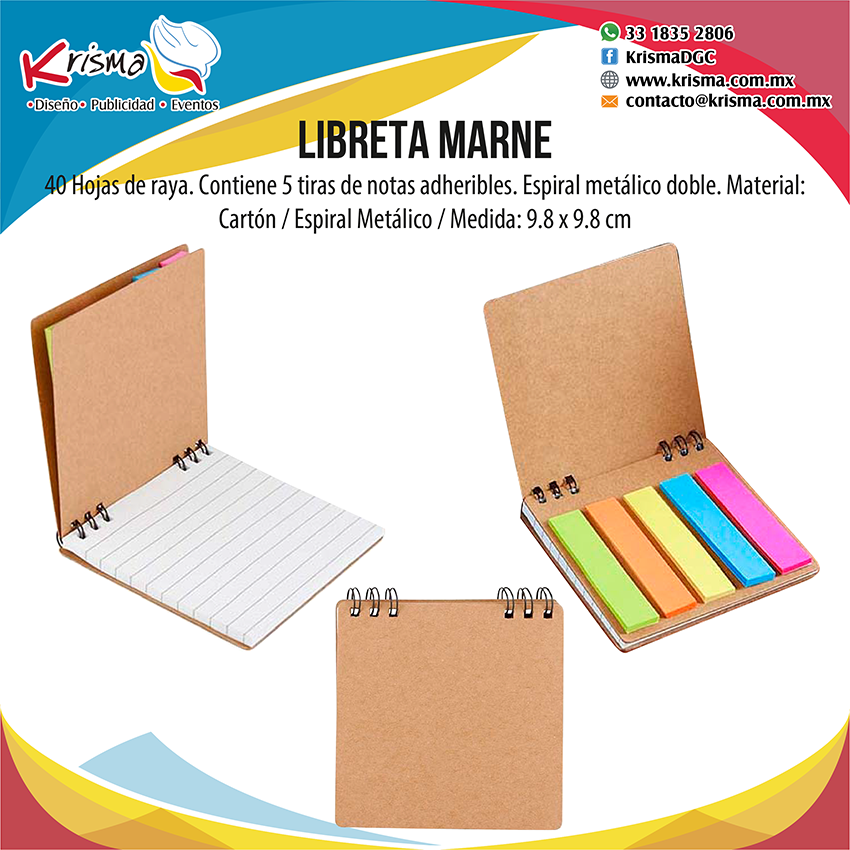 Libreta con 40 Hojas de raya. Contiene 5 tiras de notas adheribles. Espiral metálico doble.